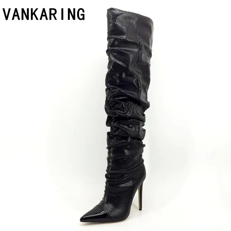 Kopen Goedkoop VANKARING merk snake microfiber leer vrouwen over de knie hoge laarzen sexy puntschoen western laarzen vrouw jurk dans laarzen Prijs