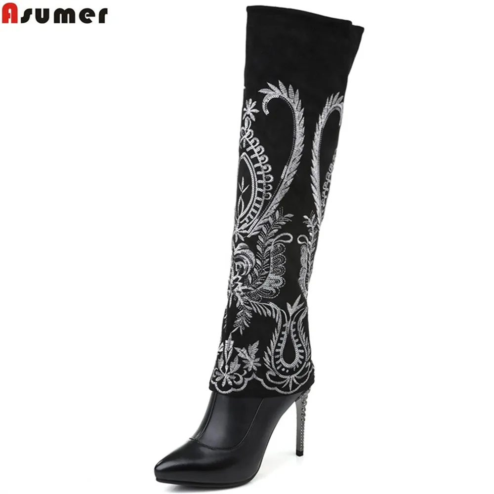Beste Kopen ASUMER 2018 nieuwe vrouwen laarzen puntschoen lederen laarzen rits dunne hakken koe lederen borduur laarzen Goedkoop