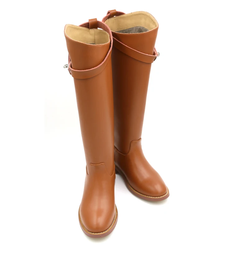 Beste Kopen Merk Nieuwe Vrouw Laarzen Lage Hak Lange Booties Metalen Gesp Ontwerp Schoenen Vrouw Lederen Hommes Chaussures Effen Knie Laarzen Herfst Goedkoop
