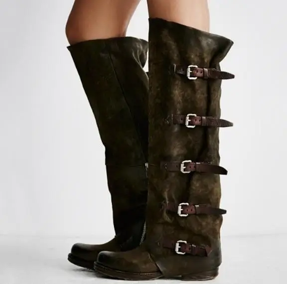 Kopen Goedkoop Dames Platte Punk Nubuck Rijden lange Laarzen Herfst Winter Hoge Top Gesp Westerse Motorlaarzen vrouwen Schoenen Maat 34 44 Online