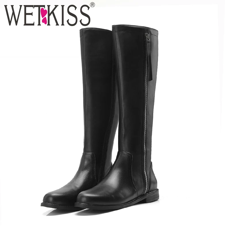 Kopen Goedkoop WETKISS Knie Hoge Vrouwen Laarzen Ronde Neus Zip Schoeisel Dikke Lage Hakken Vrouwelijke Rijlaars Koe Lederen Schoenen Vrouw Winter 2018 Nieuwe Prijs