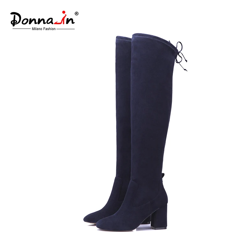 Beste Kopen Donna in hoge laarzen boven knie elastische microfiber vrouw booties vierkante teen dikke hakken dames schoenen mode lange laarzen 2018 nieuwe Goedkoop