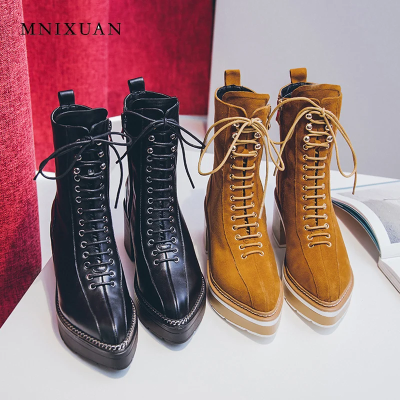 Kopen Goedkoop MNIXUAN hoge kwaliteit schoenen martin laarzen vrouwen 2018 winter nieuwe puntschoen platform hoge hakken lace up rits enkellaars size43 Prijs
