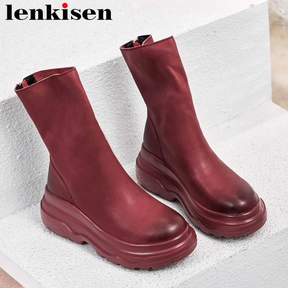 Kopen Goedkoop 2018 vintage effen waterdichte ronde neus hoge dikke bodem rits zachte natuurlijke lederen hoge mode vrouw mid kalf laarzen l87 Online