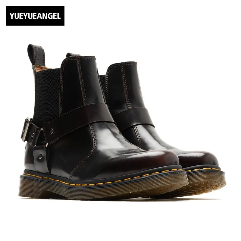 Kopen Goedkoop Lederen Chelsea Laarzen Vrouwen Gesp Ronde Neus Slip Op Martin Laarzen Hoge Kwaliteit Vintage Rood Groen Platte enkellaarsjes Online