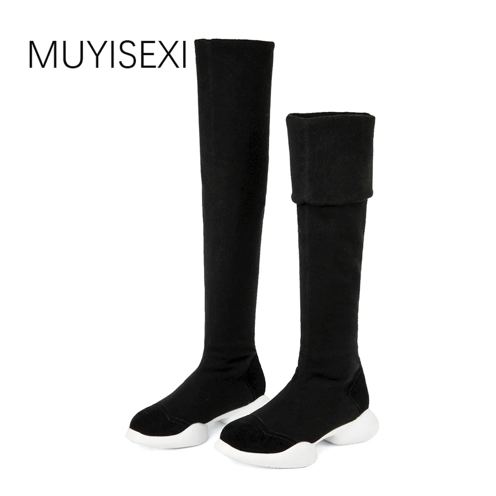 Goede Koop Over de Knie Hoge Laarzen Echt Leer + Stretch Elastische Laarzen Buis Winter Platte Platform Vrouwen Winter Schoenen BLQ01 MUYISEXI Goedkoop