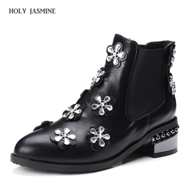 Kopen Goedkoop 2018 Winter Nieuwe applicaties chelsea laarzen vrouwen strass applicaties enkellaars kristal bloem punk schoenen plus size 43 PU leer Online