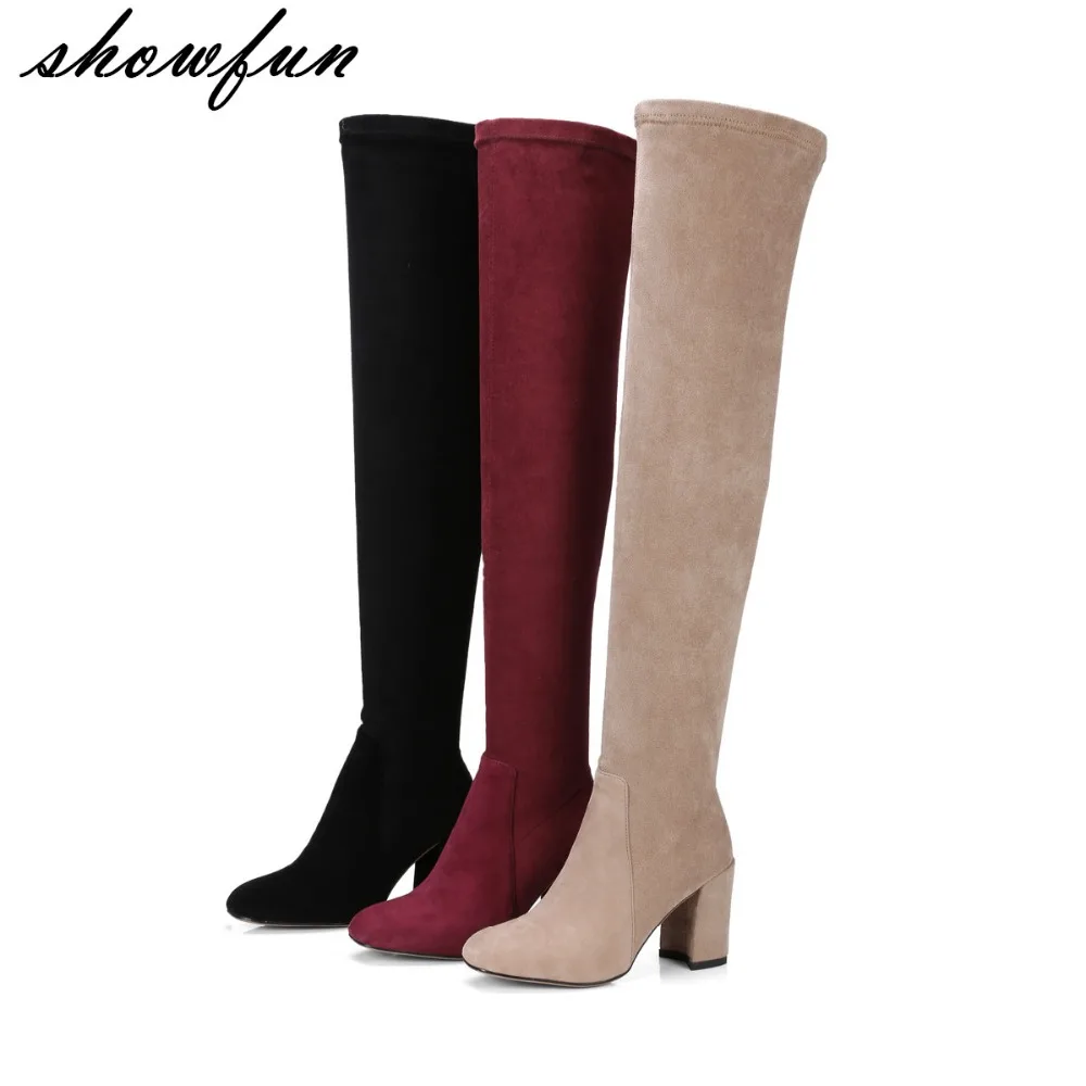 Kopen Goedkoop 2017 Herfst vrouwen Echt Su egrave;de Stretch Over De Knie laarzen Merk Ontwerp Dikke Hoge Hak Slanke Dames Lange Laarzen schoenen Prijs