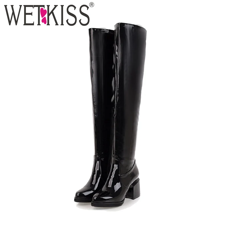 Beste Kopen WETKISS Over De Knie Vrouwen Laarzen Ronde Neus Schoeisel Hoge Hakken Dame Boot Patent Pu Schoenen Vrouw 2018 Winter Nieuwe plus Size 34 48 Goedkoop
