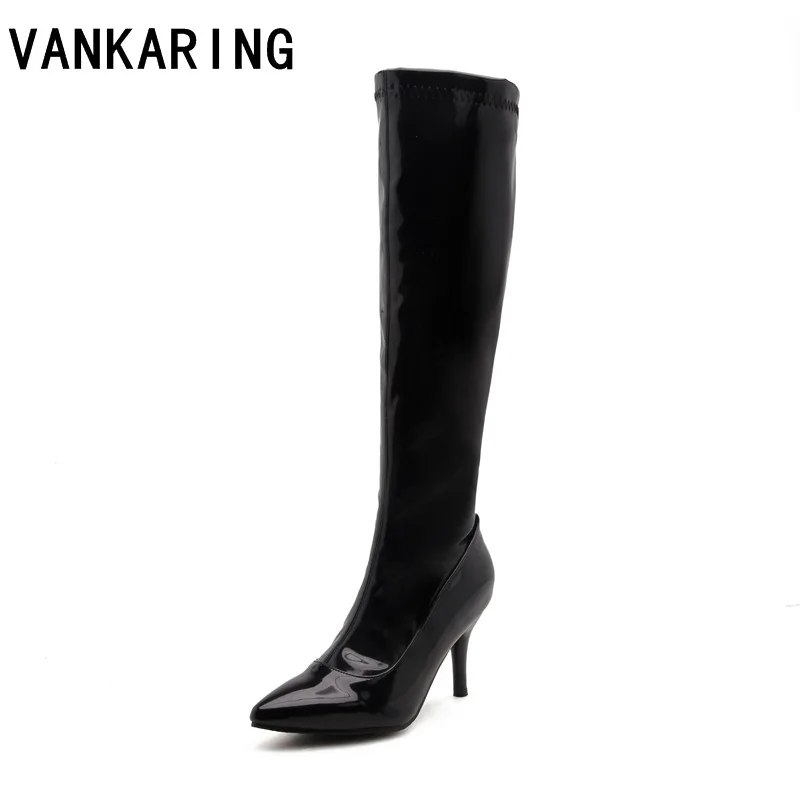 Kopen Goedkoop VANKARING herfst laarzen klassieke zwart rood lakleer elasticiteit knie hoge laarzen voor vrouwen schoenen warmful winter laarzen vrouwen Prijs