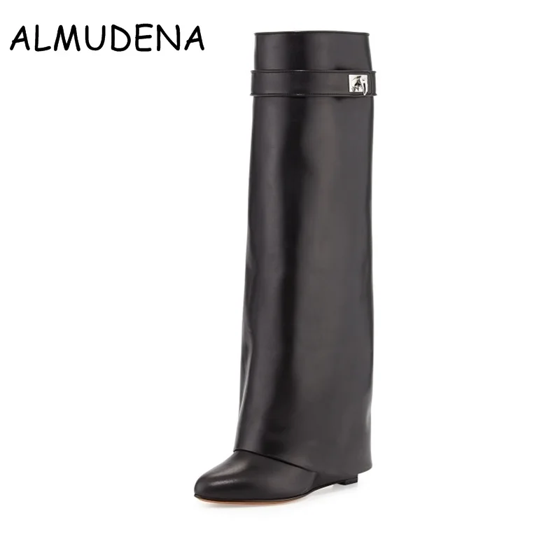 Beste Koop Wedge Shark Lock Vrouwen Knie Hoge Laarzen Instappers Vouw