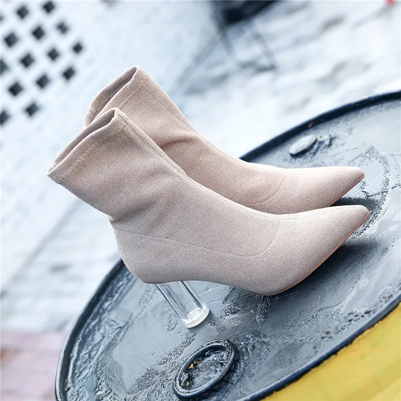 Beste Koop Kjstyrka 2019 Vrouwen Schoenen Mid Kuit Laarzen Mode Stretch Stof Transparante Hoge Hak Spitse Teen Sok Laarzen Winter Vrouwen Laarzen Goedkoop