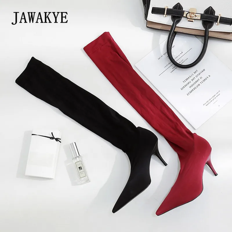 Goede Kopen 2018 Zwart Rood Stretch Sok Laarzen Vrouwen Puntschoen Strange Hakken Vrouw Sexy Slim Over De Knie Laarzen Goedkoop