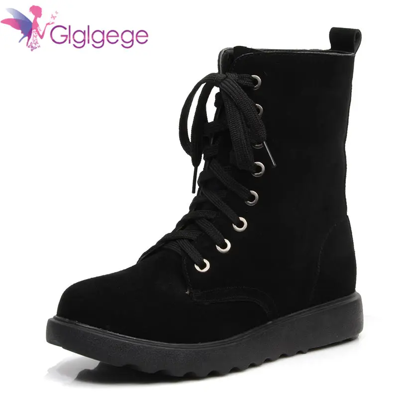 Goede Kopen Glglgege 2018 Lace Up Winter Booties Scrub Leer Mode Pluche Enkel Laarzen Toevallige Lederen Laarzen Goedkoop