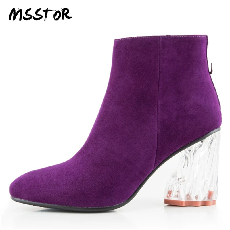 Kopen Goedkoop MSSTOR Kristal Transparante Hak Vrouwen Enkellaarsjes Fashion Party Paars Herfst Winter Laarzen Vrouwen Ronde Neus Hoge Hakken Laarzen 7 cm Prijs