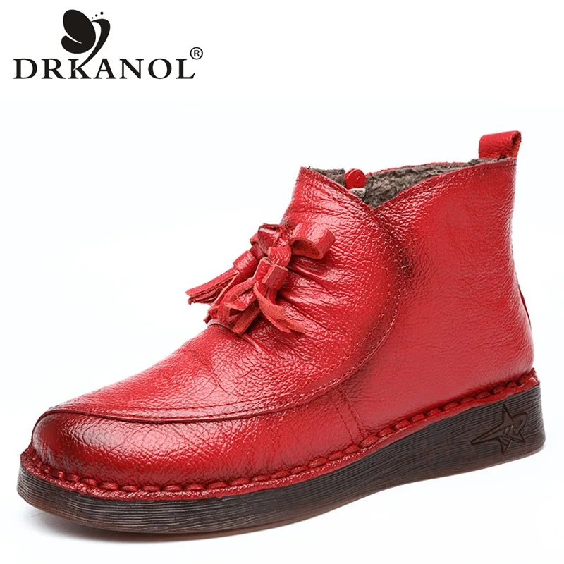 Beste Koop DRKANOL Handgemaakte Lederen Platte Enkellaarsjes Vrouwen Winter Warm Bont Snowboots Vrouwelijke Retro Kwastje Zachte Antislip Botas h8026 Goedkoop