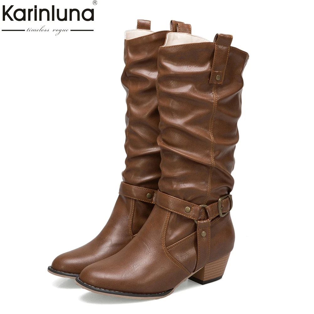 Kopen Goedkoop Karinluna 2018 Grote size 34 50 dropship retro vrouwen schoenen vrouw laarzen pu lederen western laarzen vrouw schoenen mid kalf laarzen Online