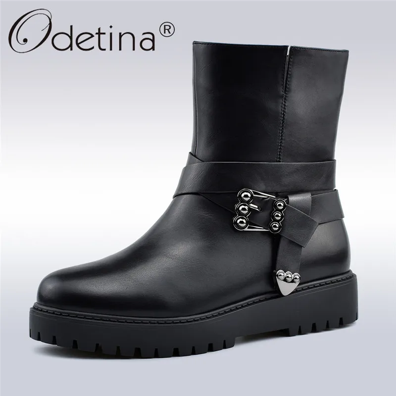 Kopen Goedkoop Odetina Nieuwe Mode Gesp Enkellaarsjes Voor Vrouwen Platte Platform Zacht Side Zip Vrouwen Laarzen Winter Warm Pluche Laarzen Grote maat 41 Online