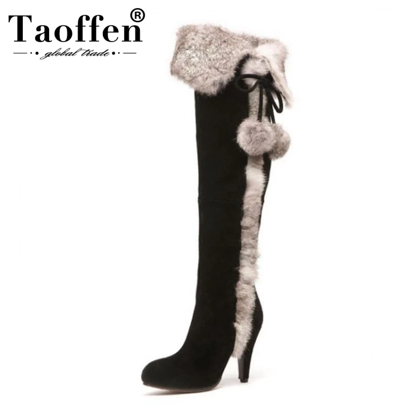 Goede Koop TAOFFEN Vrouwen Hoge Hak Laarzen Echt Leer Vrouw Schoenen Pluche Bont Over de Knie Laarzen Koreaanse Mode Schoenen Vrouw Schoenen Maat 34 40 Goedkoop