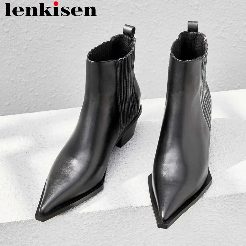 Beste Koop Lenkisen europese stijl slip op koe leer nieuwe mode kantoor dame vierkante teen med dikke hakken slip op korte chelsea laarzen L53 Goedkoop
